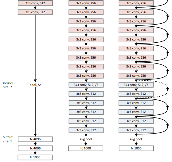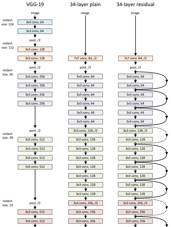 Image Source : Deep Residual Learning for Image Recognition Following diagram compares the architectures of VGG-19, a 34-layer plain convolutional network, and a 34-layer residual network. VGG-19 is structured using repeated 3×3 convolutional layers followed by pooling, gradually reducing the spatial dimensions from 224 to 7 pixels while increasing the number of feature maps from 64 to 512. Its design relies solely on sequential convolution and fully connected layers at the end. The 34-layer plain network introduces deeper stacking of 3×3 convolutions, starting with a 7×7 convolution and pooling, but still lacks shortcut connections. In contrast, the 34-layer residual network retains a similar overall depth and configuration but integrates shortcut connections that bypass sets of convolutional layers, enabling the network to learn residual functions. These shortcuts, depicted as curved arrows, connect the input of each block directly to its output, allowing identity mappings that stabilize training and make very deep networks easier to optimize. Both the plain and residual networks conclude with average pooling and a fully connected layer for classification, whereas VGG-19 ends with three fully connected layers.