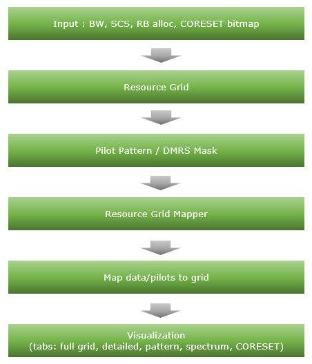 Inputs: Channel BW, subcarrier spacing, RB allocation (START_RB, NUM_RBS), CORESET bitmap/duration/start symbol, DMRS config.