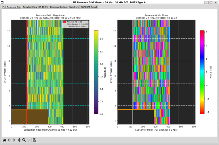 This script leverages NVIDIA's Sionna library for OFDM resource grid creation and mapping, providing a comprehensive visualization framework using Tkinter-based tabbed GUI.