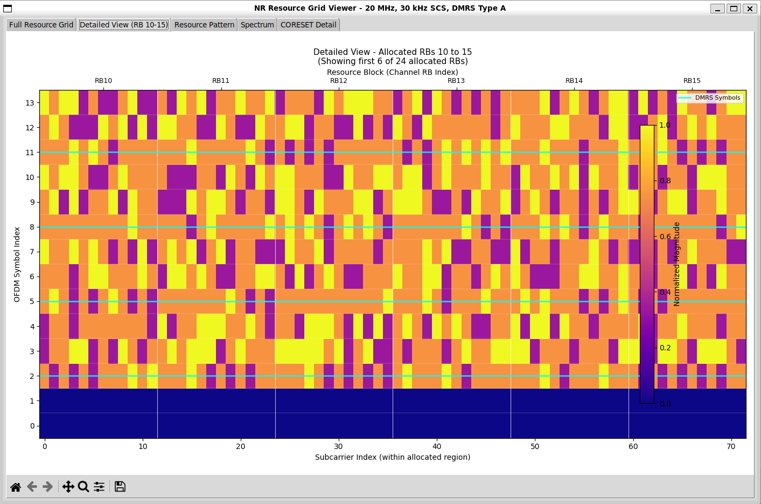 Detailed View: Zoomed view of first 6 allocated RBs showing individual subcarriers and symbols. DMRS symbols highlighted in cyan.