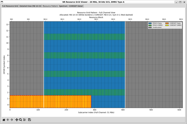 Full channel bandwidth view with allocated RBs overlay and CORESET |