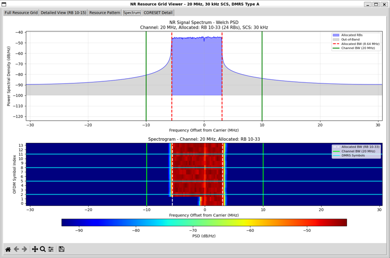 Visualization: Multiple Tkinter tabs render full grid, zoomed view, resource pattern (PDSCH/DMRS/CORESET), spectrum (PSD/spectrogram), and CORESET detail.