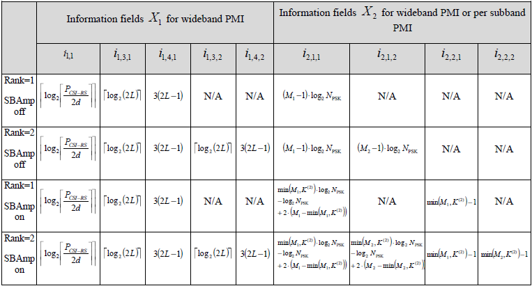 A CSI Reporting Setting is said to have a wideband frequency-granularity if otherwise, the CSI Reporting Setting is said to have a subband frequency-granularity. PMI TablesFollowings are summaries on correlations on Type, number of layers, number of CSI antenna ports & dimension and specific mapping table. But it would not be easy to make sense out of this summary table. To understand each of these tables in detail, I would suggest you go through TDocs in reference section (or at least high level descriptions in this note) to get some big picture first and then you need to construct a few specific PMI matrix by hands as I did in example sections.