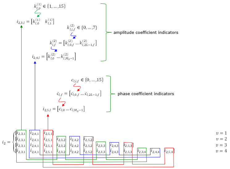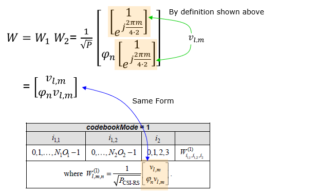 Derivation of W matrix ExamplesIn this section, the final matrix you will derive will be in the form of complex number elements. The user data (i.e, PDSCH data) is also in the form of complex number (I and Q data). Eventually you should be able to visualize the properties of these matrix in your brain to make sense out of those matrix. Here goes another type of my notes that may help you with the intuitive understandings on the matrix with complex number elements being applied to complex data. Play with [Matrix Complex] Example 01 > p4, 1 Layer , N1 = 2, N2 = 1, O1 = 4, O2 = 1, i1,1 = 0 i1,2 = 0 i2 = 0Let's assume that PMI table is configured according to following table(Table 5.2.2.2.1-5).