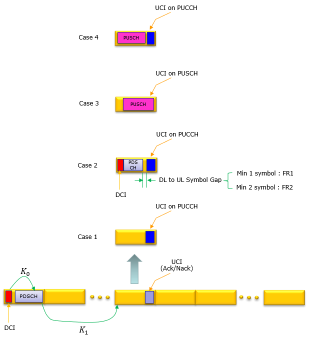 Downlink SchedulingNow let's look into a typical downlink scheduling (i.e, PDSCH scheduling). This process can be illustrated as follows, the process can be summarized as follows. i) NW (Network) send DCI for PDSCH (PDSCH Grant) ii) After K0 slots after the DCI, PDSCH is transmitted (K0 can be any value from 0 through 32, but as of Sep 2021, only K0 = 0 seems to be supported). iii) After k1 slots after the PDSCH is transmitted, UE transmit Ack/Nack via UCI. The UCI can be carried by PUCCH or PUSCH depending on situations. The slot carrying the UCI can be utilized in various different form which can be examplified as Case 1,2,3,4 as shown below).