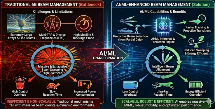 Beam Management EnhancementIn 6G, beam management becomes one of the most demanding procedures because the system must support extremely large antenna arrays, fine-grained beam directions, and multi-TRP operation across diverse frequency ranges including FR3. Compared to 5G, where beams are moderately wide and updated periodically, 6G beams are narrower, more numerous, and must be updated far more frequently to maintain link reliability in high-mobility or blockage-prone environments. Traditional NR beam management relies heavily on periodic beam sweeping, CSI-RS/SSB–based measurements, and fixed beam refinement procedures. These mechanisms become inefficient as the number of beams per TRP grows and the number of TRPs per UE increases. This results in large control overhead, increased power consumption, and slow reaction time. AI/ML enables 6G to infer optimal beams from partial measurements, predict beam transitions before they occur, and reduce the need for exhaustive sweeping. As a result, AI-based beam management becomes a fundamental enabler for scalable massive MIMO, robust mobility, and energy-efficient operation.