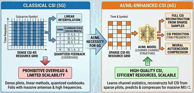 MotivationThe main reason AI/ML becomes necessary for CSI enhancement is that classical CSI acquisition and feedback mechanisms do not scale with 6G requirements. In 5G, CSI relies on relatively dense CSI-RS patterns, linear interpolation, and quantized feedback via predefined codebooks. These mechanisms assume moderate antenna counts, stable channel statistics, and limited feedback budgets. In 6G, these assumptions no longer hold. The number of antennas and layers increases dramatically, the channel coherence shrinks at higher frequencies, and multi-TRP operation creates spatial inconsistencies that make the existing CSI structures inefficient. If CSI-RS density or feedback precision is increased using traditional methods, overhead quickly becomes prohibitive in both DL and UL directions. AI/ML provides a new alternative by learning the statistical structure of the channel, enabling reconstruction of full CSI matrices from sparse RS samples, predicting CSI across time or frequency, and compressing CSI using neural autoencoders instead of fixed codebooks. This allows 6G to obtain richer CSI while using far fewer radio resources. As a result, AI/ML becomes the only practical way to deliver high-quality CSI for 6G massive MIMO without overwhelming the resource grid or feedback channel.