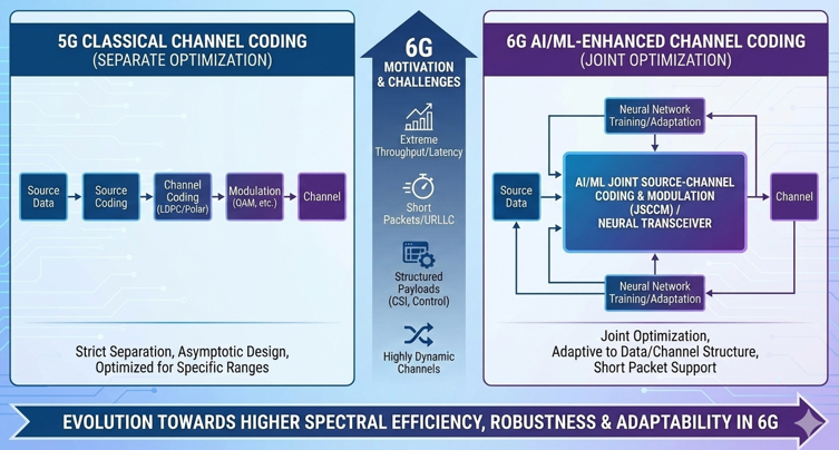 MotivationThe motivation for JSCC/JSCCM in 6G comes from the limitations of the conventional “separation principle” when applied to short-blocklength, structured, or highly constrained feedback scenarios. Traditional designs first apply source compression, then channel coding, then modulation, assuming ideal interfaces between these layers and asymptotically long blocks. In 6G, many key payloads such as CSI, beam-related feedback, or DCI are short, highly structured, and extremely sensitive to delay and error. Under these conditions, separate design leads to suboptimal use of bits and radio resources, and the overhead of protecting and quantizing such information can become a bottleneck. JSCC/JSCCM addresses this by allowing the system to learn redundancy and symbol mapping jointly, directly over the physical channel model, and by tailoring the representation to the actual statistics of the payload and the channel. This provides a path to reduce overhead for CSI/feedback, improve robustness in harsh channels, and enable new types of PHY-level representations, including for ISAC or other 6G-advanced scenarios.
