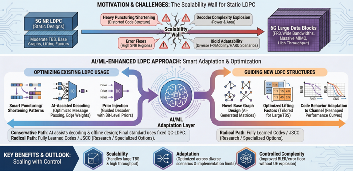 MotivationThe main motivation for AI/ML in channel coding for large data is that static LDPC designs do not scale gracefully when both codeword length and required throughput grow. In NR, the current base graphs and lifting values were tuned for a certain range of TBS, code rates, and layer numbers. They already work close to the limit in many scenarios. When 6G pushes to much larger TBS and higher peak rates, we usually extend the same design by heavier puncturing, shortening, or concatenation. This keeps the implementation simple, but the code structure becomes distorted. Minimum distance gets worse, harmful short cycles appear more often, and the error floor starts to show up exactly in the high-SNR region where 6G wants to operate. At the same time, decoders must run faster and support more parallelism. A straightforward way is to increase the number of iterations or add more ad-hoc tweaks like scaling and damping, but this quickly explodes power and area on the UE side. The problem gets even harder when we consider that 6G will not use a single “typical” channel. It must cover FR1, upper-mid bands, and FR3, different mobility levels, different HARQ strategies, and different segmentation patterns. A single frozen LDPC design with fixed base graphs and lifting values cannot be optimal across all these axes. So we need a way to adapt code behavior to channel conditions, to large-block structures, and to implementation limits. AI/ML gives this missing adaptation layer. It can reshape how messages are passed in the decoder, how priors are injected, and how base graphs and liftings are chosen during design. Therefore the core motivation is simple: if we keep static LDPC, we hit a scalability wall in BLER, error floor, and complexity for large data. If we combine LDPC with AI/ML, we get a realistic chance to keep error performance and complexity under control even as 6G pushes codeword length and throughput far beyond NR.