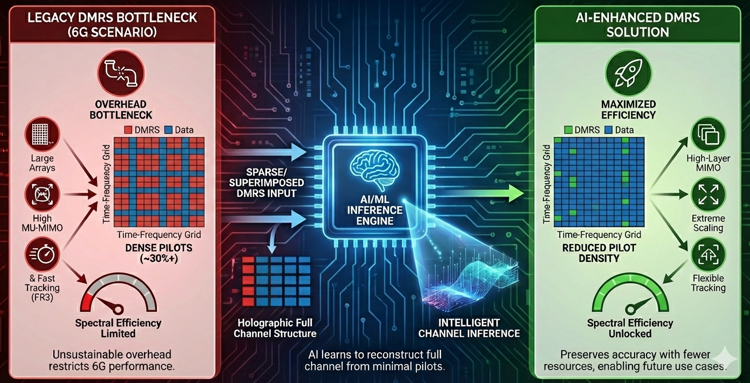 MotivationThe main reason AI/ML becomes necessary for DMRS improvement in 6G is that the traditional receivers are no longer capable of extracting accurate channel information when DMRS density is aggressively reduced. In 5G, the channel estimation process depends heavily on orthogonal pilots and structured interpolation across time and frequency. This approach only works well when enough pilots are available and the channel changes slowly enough for linear or MMSE-based interpolation to remain valid. In 6G, none of these assumptions hold. The number of DMRS ports increases dramatically with massive MIMO, the channel coherence shrinks in upper-mid and FR3 bands, and multi-layer scheduling creates irregular pilot patterns that break the neat structure assumed by legacy estimation algorithms. If we try to reduce DMRS overhead using conventional methods, the channel estimation error increases sharply and leads to large BLER and throughput degradation. AI/ML provides a fundamentally different capability: it can learn the underlying structure of the propagation environment and the statistical relationship between sparse pilots and the full channel matrix. This allows the receiver to infer dense channel information from sparse DMRS, or even from superimposed DMRS embedded inside data, something impossible for classical LS/MMSE-based receivers. As a result, AI/ML becomes the only practical way to maintain channel-estimation accuracy while reducing DMRS density in the time, frequency, and spatial domains. It enables high-port, high-layer 6G operation without letting pilot overhead dominate the resource grid, and therefore is an essential component of achieving 6G-level spectral efficiency under massive MIMO and fast-varying channels.
