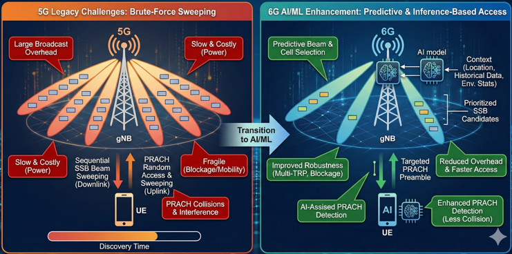 Initial Access EnhancementIn 6G, initial access must cope with much narrower beams, larger antenna arrays, and operation over wider frequency ranges, including FR3, than in 5G. The legacy NR approach relies heavily on SSB-based cell search and PRACH-based random access, with beam sweeping on the downlink and potentially on the uplink. As the number of beams, cells, and carriers increases, exhaustive or semi-exhaustive sweeping becomes too slow and too costly in terms of overhead and UE power. In addition, blockage, mobility, and multi-TRP deployments make the initial access process more fragile, since the best beam or TRP may change quickly or be temporarily unavailable. AI/ML enables 6G to move from brute-force sweeping to predictive and inference-based initial access, where the network and UE use prior information and learned models to narrow down beam and cell candidates, detect PRACH more robustly, and reduce access delay. As a result, initial access enhancement with AI/ML becomes a key use case for improving both user experience and network efficiency in 6G.