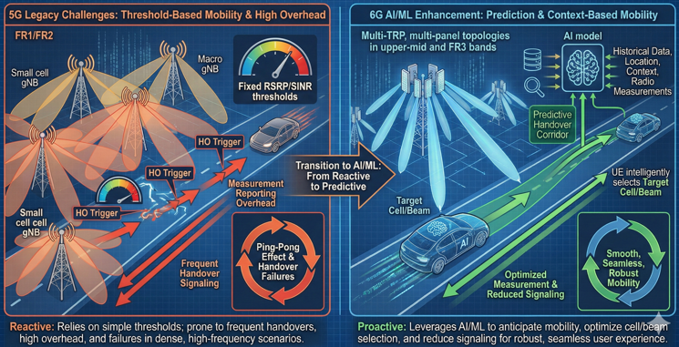 MotivationThe motivation for applying AI/ML to mobility comes from the limitations of conventional handover and reselection procedures when extended to dense, beam-centric 6G deployments. Legacy mechanisms rely on RSRP/RSRQ/SINR thresholds and hysteresis-based events (e.g., A3, A5) with static or semi-static measurement configurations. In dense deployments, this can result in frequent event triggering, large measurement reporting overhead, and suboptimal target-cell selection, particularly for UEs in high mobility or at cell edges. In upper-frequency bands, the environment changes rapidly due to blockage and fast fading, making it difficult to maintain stable coverage using simple rules. AI/ML can exploit historical mobility traces, radio measurements, and context (location, time-of-day, traffic) to predict future serving cells or beams, adjust measurement and reporting behavior, and anticipate handover needs. This allows 6G to reduce unnecessary measurements and signaling while improving handover robustness and user experience.