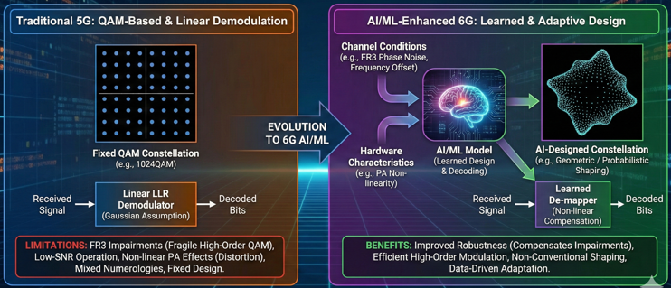 MotivationThe main motivation for AI/ML-based modulation and demodulation enhancement in 6G comes from the growing mismatch between classical QAM designs and real-world 6G operating environments. High-order QAM constellations (e.g., 1024QAM, 4096QAM) become extremely fragile under FR3 phase noise, frequency offset, and PA non-linearity. Traditional LLR demodulators assume linear Gaussian channels and cannot exploit the true statistics of hardware impairments or non-linear distortion. Furthermore, probabilistic and geometric shaping require optimized constellation distributions that are difficult to design analytically. AI/ML provides a data-driven pathway to design constellations, learn demappers, and compensate complex impairments that classical analytical methods cannot handle effectively.