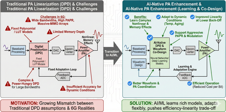 MotivationThe motivation for applying AI/ML to PA enhancement in 6G arises from the growing mismatch between traditional DPD assumptions and the realities of wideband, multi-antenna transmitters. Classical PA linearization methods often rely on polynomial or lookup-table models with limited memory depth, tuned for relatively narrowband operation and slowly varying conditions. In 6G, PAs must cope with very wide instantaneous bandwidths, carrier aggregation, dynamic spectrum use, and a larger range of operating points as traffic and beam patterns evolve. This increases both the dimensionality and variability of the nonlinearity to be compensated. Moreover, massive-MIMO and distributed RU deployments multiply the number of PAs, making per-PA calibration and adaptation difficult with purely hand-crafted models. AI/ML can learn rich nonlinear input–output relationships with memory effects, capture temperature and aging behavior, and adapt more flexibly to changing conditions. This enables improved linearity at lower back-off, support for more aggressive PAPR and modulation schemes, and better coordination between waveform design and PA operation.