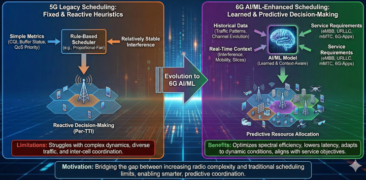 MotivationThe motivation for AI/ML-based scheduling in 6G arises from the increasing gap between the complexity of the radio environment and the expressiveness of traditional scheduling rules. Legacy schedulers typically rely on proportional-fair or similar metrics computed per TTI, assuming relatively stable interference, homogeneous traffic profiles, and limited coordination across cells or TRPs. In dense 6G deployments, interference patterns fluctuate rapidly, traffic demands vary widely across users and slices, and coordination between cells, beams, and carriers becomes more important. Fixed heuristics may fail to capture these multi-dimensional trade-offs, leading to suboptimal throughput, latency, and fairness. AI/ML can learn from historical traffic and channel data to predict near-future conditions, identify beneficial scheduling patterns, and align resource allocation with service-level objectives. This allows schedulers to become predictive and context-aware rather than purely reactive.