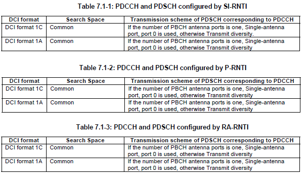 Those tables from 3GPP 36.213 shows the relationships between RNTI Type, Transmission Mode and DCI format. (You would notice that same information (same RNTI type) can have multiple candidates of DCI format. Then, the question is "How network determine which DCI format it has to use at a specific moment ?". In some case, you can find a clear criteria from following table, but some other case the selection criteria is not clear. For example, if you ask "Do I have to use DCI format 1A or 2A when I am using TM3, C-RNTI ?". You may say "Use DCI format 2A in MIMO configuration and use 1 A in non-MIMO configuration". But the answer would not be clear if you ask "What kind of DCI format (1A or 1C) for Paging message (P-RNTI) ?". At least table 7.1-2 does now show any different selection criteria and I haven't found anywhere else in the spec about this selection criteria. In this case, I just ask to several other people who is working on that specific area and trying to draw conclusion by a kind of 'vote'. For this specific case (DCI format for P-RNTI), I got the response saying "There is no clear criteria, it is just upto network on which one to pick".)