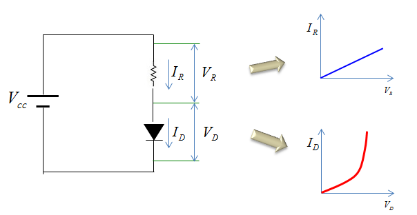 Let's assume that we know the value of Vcc and the the resistance value. and we have question sayinig "What would be the value of the current flowing through the resistor and diode and voltage across the resistor and diode ?".