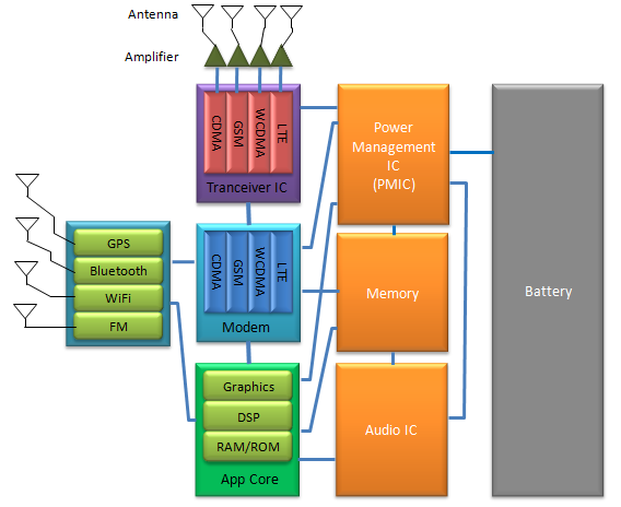 Everybody would realize that a mobile device has been providing more and more radio technologies and applications as it evolves. If you build all the radio technologies and application of a current smart phone in the same technology as you used in the first generation brick phone, the size of current smart phone would be as huge as back-pack or briefcase. But in reality, you would get smaller and smaller (at least thinner and thinner) devices as it evolves while you are getting more functions in it. The technologies that has made this kind of evolution possible would be "Integration multiple functions into a single chip". Now (as of now, the year 2013), if you dismantle a mobile device you would only see a handful of chips and several small components around chips. The overall device architecturing showing the most common ICs can be illustrated as follows.
