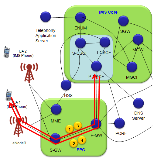 (1) : REGISTER (Path : UA1 --> eNodeB --> S-GW --> P-GW --> P-CSCF)