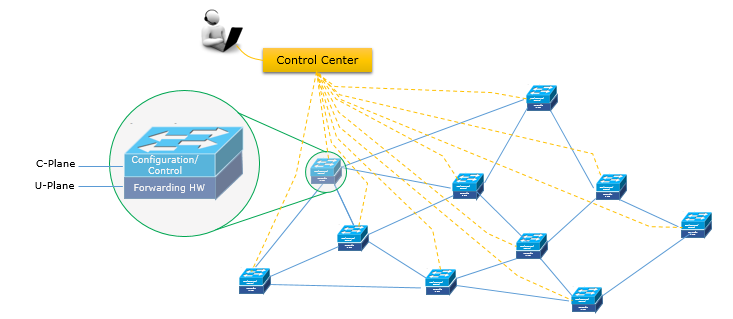 Naturally, you would come up with a question. How do we cope with those issues listed above ? The new technology that came out to cope with these issue was SDN (Software Defined Networking). The fundamental idea on SDN can be illustrated as shown below. It is to setup a centeralized Control Center and hook up all the individual network components to the centeralized Control Center. And then, configure those individual components remotely with software technology.