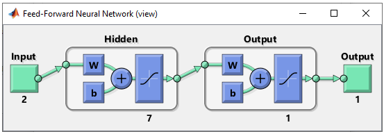 This structure can be created by following code. Compare this with perceptron network case for the same network shown here and see how simpler it is to use feedforwardnet() function. Basically it is just one line of code to create the network and additional lines after feedforwardnet() is to change some parameters. If you want to use the default parameters, you don't need to add those additional lines. net = feedforwardnet(7); % NOTE : the number 7 here indicate the number of neurons in the first layer % (i.e, the hidden layer in the whole network). You don't need to specify Output % layer because it is automatically set by the output data you are poassing in % train() function. net.performFcn = 'mse'; net.trainFcn = 'trainlm'; net.divideFcn = 'dividetrain';