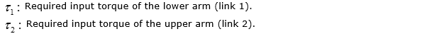 Step 6: Calculate the required torque for both the lower and upper arms using the following equations: The required torque for actuation of the lower arm