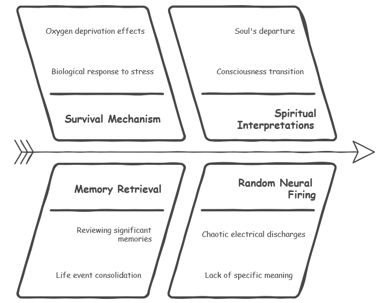 - Life Review: Serotonin, a neurotransmitter involved in memory and mood, may be released in large quantities during stress, potentially leading to the life review phenomenon where past memories rapidly resurface. Serotonin surges may be detectable as heightened EEG activity due to their role in memory processing.
