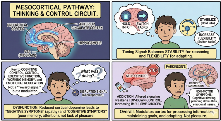 Mesocortical Dopamine PathwaysThe mesocortical dopamine pathway is a major circuit that begins in the ventral tegmental area (VTA) of the midbrain and projects to several higher-order brain regions, including the prefrontal cortex, the anterior cingulate cortex, and parts of the hippocampal formation. This pathway is closely linked to cognitive control, executive function, working memory, emotional regulation, and the ability to evaluate complex choices. Dopamine signals in this pathway do not act as a “reward signal.” Instead, they modulate how the cortex maintains information, updates decisions, and regulates attention. Dopamine arriving in the prefrontal cortex works differently from dopamine arriving in the nucleus accumbens. In the cortex, dopamine acts more like a tuning signal. It stabilizes neural activity when the brain needs to hold information in mind, and it increases flexibility when the brain needs to switch tasks or re-evaluate a choice. This balance supports reasoning, planning, impulse control, and emotional adjustment. The anterior cingulate cortex uses dopamine signals to monitor conflict, detect errors, and prioritize goals. The hippocampus uses dopamine to tag certain events as important for long-term memory formation. Dysfunction in the mesocortical dopamine pathway is implicated in several psychiatric conditions, especially those involving deficits in executive function. In schizophrenia, reduced or disrupted dopamine signaling in the prefrontal cortex is one proposed mechanism behind negative symptoms such as apathy, reduced initiation of behavior, and diminished emotional expression. Impaired dopamine modulation here is also associated with cognitive symptoms such as poor working memory, reduced attention, and difficulty with complex reasoning. These effects arise from unstable or inefficient cortical circuits, not from changes in “pleasure.” Drug addiction also affects the mesocortical pathway, but the mechanism is indirect. Repeated drug exposure alters dopamine signaling not only in mesolimbic regions but also in cortical circuits that regulate planning and self-control. This can weaken the ability to evaluate long-term consequences and strengthen impulsive choice patterns. The dysfunction does not come from dopamine creating pleasure. It comes from distorted learning signals and reduced top-down control. The mesocortical pathway is not the primary pathway affected in Parkinson’s disease, but it can still be involved. Parkinson’s disease is mainly caused by degeneration of dopamine neurons in the substantia nigra, which primarily affects the nigrostriatal pathway and leads to motor symptoms. However, VTA neurons can also degenerate to some degree, resulting in reduced dopamine transmission to the prefrontal cortex. This reduction contributes to cognitive slowing, reduced planning ability, and difficulties with emotional regulation. These are sometimes referred to as “non-motor symptoms” of Parkinson’s disease. Overall, the mesocortical dopamine pathway is essential for higher-order thinking and emotional balance. It does not produce pleasure or reward. Instead, it modulates how the cortex processes information, maintains goals, and adapts to new conditions. Understanding this pathway clarifies why dopamine plays such diverse roles across different brain regions and why disruptions here can result in cognitive and emotional symptoms rather than changes in reward experience.