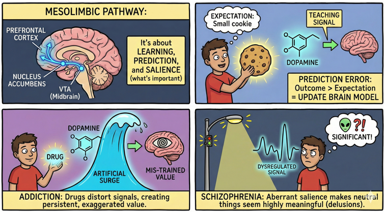 Mesolimbic Dopamine PathwaysThe mesolimbic dopamine pathway is one of the major dopamine circuits that start from the ventral tegmental area (VTA) in the midbrain and project to several key regions, most notably the nucleus accumbens, the olfactory tubercle, parts of the amygdala, and sections of the prefrontal cortex. This pathway is often associated with reward-related processing, but the actual mechanism is more about learning, prediction, and the assignment of value rather than simply generating pleasure. The pathway sends dopamine signals when an outcome is better or worse than expected, and this signal updates the brain’s internal model of what is worth paying attention to in the future. When an organism encounters something significant, whether it is food, social interaction, novelty, or a surprising event, the mesolimbic pathway can show increased dopamine activity. This activity does not guarantee pleasure. Instead, it indicates that the event carries information that is relevant for learning or future behavior. The nucleus accumbens is one of the main targets of this signal. Dopamine release here adjusts motivation, energy for action, and reinforcement strength. This means the mesolimbic pathway is involved in shaping habits and guiding choices, not in delivering a direct “pleasure sensation.” This pathway also contributes to several psychiatric and neurological conditions, but again the mechanism is through altered learning signals or disrupted value processing, not through pleasure alone. Drugs of abuse strongly activate the mesolimbic pathway, but the critical point is that they distort prediction-error signals. They produce dopamine surges that do not match real-world outcomes, which mis-trains the system. This distortion is one reason addictive behaviors become persistent, because the brain keeps updating the “value” of the drug far beyond what would happen with natural stimuli. Abnormal activity in the mesolimbic pathway is also implicated in conditions such as schizophrenia. In this case, the issue is not excessive pleasure but dysregulated signaling. Too-strong or poorly timed dopamine signals can make neutral or irrelevant stimuli seem highly significant or meaningful. This misassignment of salience is one explanation for hallucinations and delusional interpretations. Reduced or flattened dopamine signaling in related circuits can also contribute to apathy, reduced motivation, and difficulty initiating action. The mesolimbic dopamine pathway therefore plays a central role in how the brain evaluates significance, assigns motivational weight, and updates learning. It is not a “pleasure pathway.” It is a prediction, reinforcement, and salience pathway. Understanding it in this more accurate way prevents common myths and provides a clearer view of how dopamine supports both healthy behavior and the symptoms seen in various disorders.