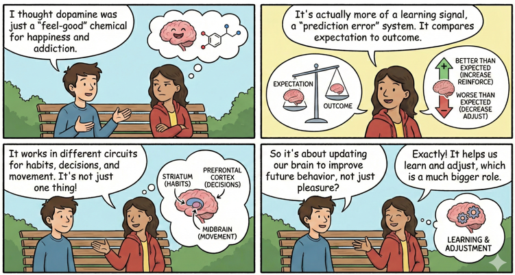 Myth about DopamineMany people describe dopamine as the “feel-good chemical,” but this is only a small part of what dopamine really does. The deeper mechanism is very different. Dopamine acts more as a learning signal. It works by comparing what you expect and what you actually get. So it increases when the outcome is better than expected, and it decreases when the outcome is worse than expected. This is a prediction-error system. This mechanism trains the brain. It adjusts future behavior. It updates choices. It fine-tunes habits. This learning process is the fundamental reason behind many behaviors that people mistakenly attribute to simple “pleasure.” Another big reason behind the myths is oversimplification. People often reduce a multi-layer biological process into a single phrase. They say dopamine equals pleasure. They say more dopamine equals more happiness. They say high dopamine equals addiction. These are inaccurate or incomplete. Dopamine works in multiple circuits. Dopamine in the striatum shapes habits and reinforcement. Dopamine in the prefrontal cortex regulates decisions and working memory. Dopamine in the midbrain modulates movement. Each circuit has different receptor types, different time scales, and different roles. So the same molecule behaves differently depending on the circuit. The over-simplified idea creates many misunderstandings. It leads to the belief that dopamine is only about pleasure. It leads to the belief that dopamine spikes automatically create addiction. It leads to the belief that low dopamine always means low motivation. These interpretations ignore the actual mechanism. Dopamine is not a direct “reward chemical.” It is a signal that updates internal models. It teaches the brain what is better than expected, what is worse than expected, and what should be repeated or avoided. It operates like a feedback controller in engineering, so it adjusts the system based on errors between expectation and outcome. When we understand dopamine in this way, many myths fade away. Dopamine is not about constant pleasure. It is about constant learning. It does not simply make you feel good. It teaches you what mattered, and how much. It shapes your behavior over time. It is dynamic, context-dependent, and always interacting with other neurotransmitters. A more accurate view is that dopamine supports prediction, adjustment, and improvement rather than continuous happiness. This perspective makes the complex stories around dopamine much clearer and removes the common myth that dopamine alone drives our behavior.