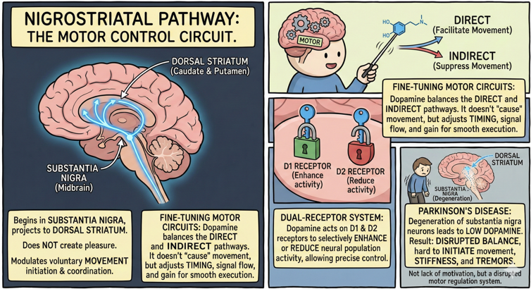 Nigrostriatal Dopamine PathwaysThe nigrostriatal dopamine pathway is one of the core motor-control circuits in the brain. It begins in the substantia nigra pars compacta, a dopamine-producing region in the midbrain, and projects to the dorsal striatum, which includes the caudate nucleus and putamen. This pathway does not create pleasure signals. It primarily modulates how the basal ganglia initiate, coordinate, and smoothly execute voluntary movements. The substantia nigra sends dopamine to the striatum to adjust the activity of two major motor circuits known as the direct and indirect pathways. Dopamine does not “cause movement” directly. Instead, it fine-tunes the balance between facilitating desired movements and suppressing unwanted or competing movements. The striatum uses dopamine to regulate signal flow, timing, and the gain of these circuits. Small changes in dopamine levels can shift how easily a movement can be started or how precisely it can be controlled. Dopamine receptors in the striatum (mainly D1 and D2 receptors) respond differently, and this dual-receptor system allows dopamine to selectively enhance or reduce the activity of specific neural populations. Through this mechanism, the nigrostriatal pathway provides the modulatory control that makes smooth, intentional movement possible. Without this modulation, movements become slow, rigid, or unstable. Damage to the dopamine neurons of the substantia nigra is the central cause of Parkinson’s disease. As these neurons degenerate, dopamine levels in the dorsal striatum drop sharply. With reduced dopamine, the direct and indirect pathways fall out of balance. Movements become harder to initiate, muscle stiffness increases, and tremors may appear. These symptoms arise from disrupted motor-circuit regulation rather than from a general lack of motivation or energy. The degeneration also affects other related pathways to varying degrees, contributing to non-motor symptoms such as slowed thinking or mood changes. The nigrostriatal pathway therefore plays a foundational role in motor control. It ensures that voluntary movement is timely, coordinated, and efficient. When dopamine signaling in this pathway becomes impaired, the result is profound motor dysfunction, which is why the pathway is central to understanding disorders like Parkinson’s disease and the physiological basis of movement in general.