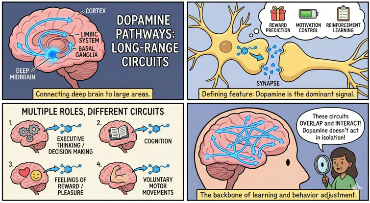 A dopamine pathway is a series of connected neurons that use dopamine as the primary neurotransmitter. It is not a single wire or a single function. It is a chain of many neurons passing signals from one region of the brain to another. The key point is that dopamine is the main chemical messenger in those synapses. This is why the pathway gets its name. The brain is not made of isolated modules that work like mechanical blocks. It is a massive web of interconnections. Each neuron can connect to thousands of other neurons. Signals pass through these connection points, called synapses. When signals propagate across a group of neurons that consistently work together for a particular function, we call that group a neural pathway. The identity of the pathway often depends on the neurotransmitter that carries the signal through most of its synapses. Dopamine pathways are one of these specialized circuits. They form long-distance routes from dopamine-producing regions in the midbrain to various target regions such as the striatum, cortex, and limbic structures. Along these routes, dopamine shapes learning, motivation, movement control, and value prediction. The presence of dopamine in the synapses makes the entire pathway sensitive to reward prediction, error signals, and reinforcement-based adaptation. This is what makes dopamine pathways so central to our behavior and our internal models of the world. There are many other types of neural pathways, each defined by different neurotransmitters and different functions. Some rely on serotonin, some on norepinephrine, some on acetylcholine, and many more. Each of them plays a unique regulatory role, and they often interact with one another. But in this note, the focus is on dopamine pathways, because they are deeply involved in motivation, learning by prediction error, motor regulation, and many forms of adaptive behavior. Understanding dopamine pathways helps clarify why dopamine-related processes are complex and multi-layered. The pathway is not just about feeling good. It is about how the brain evaluates outcomes, updates expectations, and adjusts future actions. This perspective gives a more realistic view of how dopamine works across different regions of the brain and why it influences so many aspects of our daily behavior.