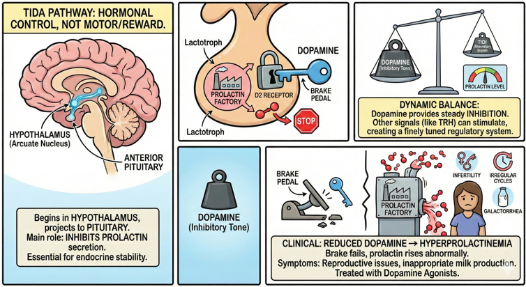 Tuberoinfundibular Dopamine PathwaysThe tuberoinfundibular dopamine pathway (TIDA) is a specialized dopamine circuit that begins in the arcuate nucleus of the hypothalamus and projects toward the anterior pituitary gland. Unlike other dopamine pathways, the TIDA pathway does not regulate movement, reward, or cognition. Its main role is hormonal control. Dopamine released by these hypothalamic neurons acts as the primary inhibitor of prolactin secretion from the pituitary gland. Prolactin is a hormone involved in lactation, reproductive physiology, immune modulation, and several growth-related processes. Under normal conditions, the pituitary continuously receives dopamine from TIDA neurons, which suppresses prolactin release through D2 receptors on lactotroph cells. This means dopamine functions as the “brake” in the prolactin system. When dopamine levels drop, prolactin secretion increases. When dopamine levels rise, prolactin secretion decreases. The system is dynamic and forms a homeostatic loop between the hypothalamus and pituitary. The balance between dopamine and prolactin is influenced by other hypothalamic signals. For example, thyrotropin-releasing hormone (TRH) can stimulate prolactin release, while dopamine opposes this effect. This creates a finely tuned regulatory system where the TIDA pathway provides ongoing inhibitory tone, and other hormones provide context-dependent adjustments. Clinical conditions illustrate the importance of this pathway. When dopamine production or receptor signaling in the TIDA pathway is reduced, prolactin levels can rise abnormally. This condition, called hyperprolactinemia, can lead to symptoms such as infertility, irregular menstrual cycles, low libido, and inappropriate milk production (galactorrhea). Dopamine agonist medications, which activate D2 receptors, are commonly used to restore the inhibitory signal and reduce prolactin levels. The TIDA pathway is therefore essential for endocrine stability. It shows that dopamine is not only involved in brain circuits for movement or motivation, but also functions as a hormone-regulating signal in the hypothalamus–pituitary axis. Understanding this pathway highlights the broad physiological roles of dopamine across neural and endocrine systems.