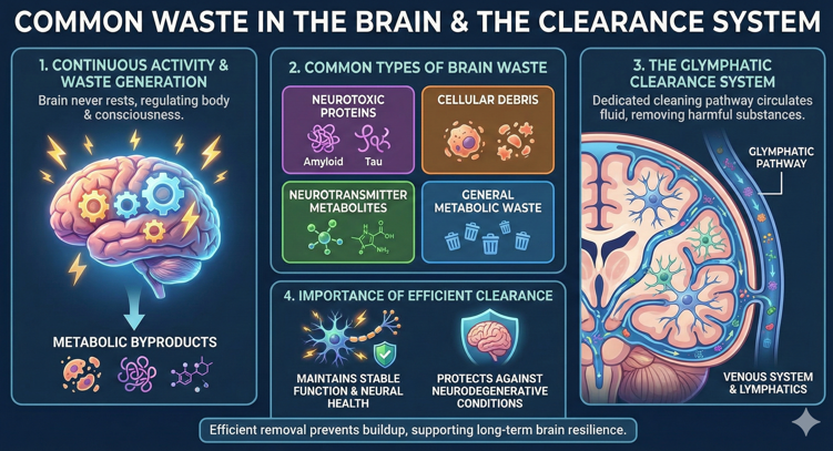 What are common waste in brain ?The brain produces several types of metabolic waste. This waste is a natural byproduct of the brain’s intense and continuous activity. The brain never fully rests. It processes information. It regulates the entire body. It keeps consciousness running. All of this requires energy. And every energy-consuming process produces waste. As a result, various substances build up inside the brain. Some of these substances can be harmful if they accumulate. Some are neurotoxic proteins. Some are small fragments of broken or old cellular material. Some are metabolites produced when neurotransmitters are used and broken down. Others come from basic metabolic reactions inside neurons and glial cells. Each type adds to the overall cleanup requirement inside the brain.