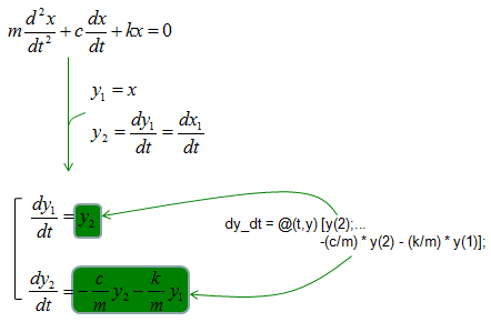 -(c/m) * y(2) - (k/m) * y(1) ];