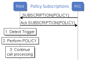 Subscription (Policy): The RIC initiates the process by subscribing to specific policies from the RAN. These policies define rules or conditions that the RAN should adhere to for optimizing network performance, managing resources, or handling specific events.