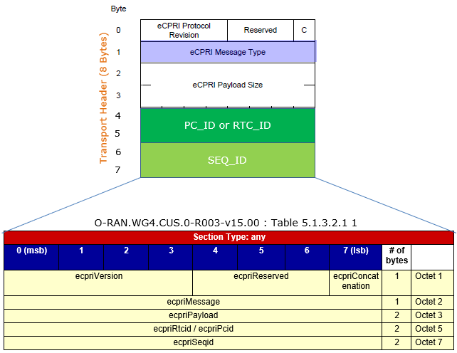 eCPRI Common Header StructureAs shown in the diagram, eCPRI packet is made up of two parts : eCPRI Common Header and eCPRI Payload. The structure of the eCPRI Common Header and eCPRI Message Type contained in the common header is shown in the diagram.