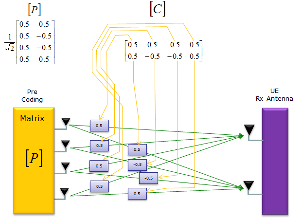 (1) Coding : This is process where user data (bit stream) go through channel coding process and converted to each codeword. DL-SCH coding process as an example, refer to "Channel Coding Processing for DL SCH/PCH/MCH" (2) Layer Mapping : This is the process where each codeword is mapped to mapped to one or multiple layers. Refer to Layer Mapping page. (3) Precoding : This is process where the layer data are allocated to multiple antenna ports (logical antenna ports in this stage). The specific Codebook for this configuration is in 4 x 2 MIMO Antenna section (If you are interested in how this codebook is derived, read the whole section of Codebook selection for Precoding - 4 Antenna Ports ) (4) Channel Path/Fading : you can get the general concept of Channel Path by refering to Channel Modeling page and refer to Fading page to understand how to derive channel correlation matrix.