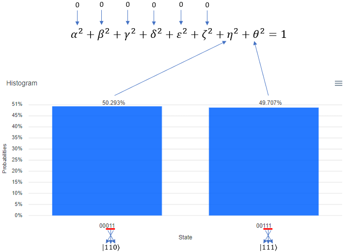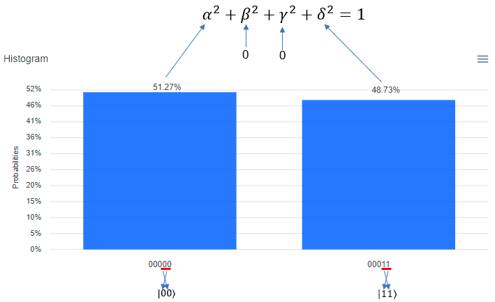 Following is the result of the execution. The percent value you see on top of each bar is the squred value of each coefficient in probability function. It means, 51.27 mean that "alpha squared" is 0.5127 and 48.73 mean that "delta squared" is 0.4873. One very important thing to notice is that the Qbit state (the bit string) shown at the bottom of each plot. The LSB (the rightmost bit) indicate q[0] in the circuit and the MSB(the leftmost bit) indicate q[5] in the circuit. Keep this in mind when you translate this into the Qbit states in braket | > notation.