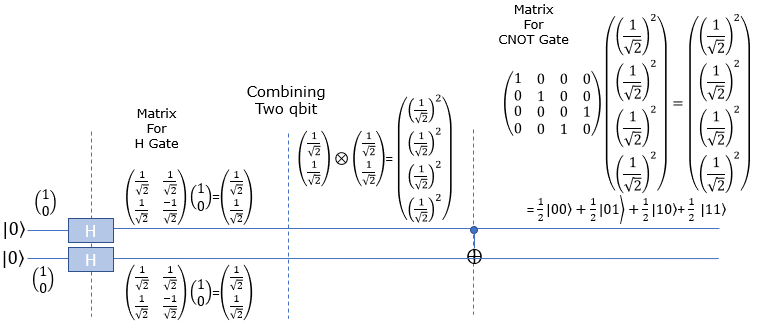 Now lets take a look at how these bits are mathematically transformed. At the beginning (leftmost), only the first Qbit |1> goes through Hadamard gate and transformed as in the second section. After the H gate, there is CNOT gate which take two Qbits as input. So we need to mathematically convert two separate Qbits into one two bit vector as shown in the third section. Then transform this two bit state vector with CNOT gate matrix as shown in the last section. The result tells that this circuit produce the superposition of |00> ,|01> ,|10> and |11> with sames chances (probabilities).