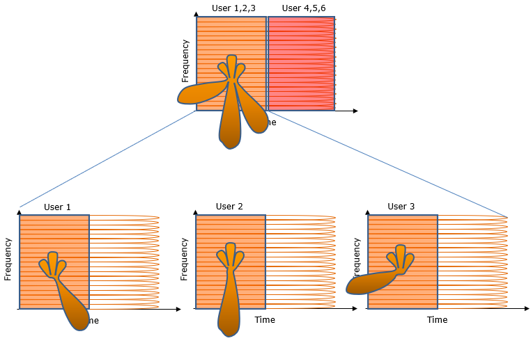 The illustration above shows only the spatial aspect of MU-MIMO and does not indicated anything about temporal aspect. So I would like to represent MU-MIMO as follows to show both spatial and temporal aspect of the operation.