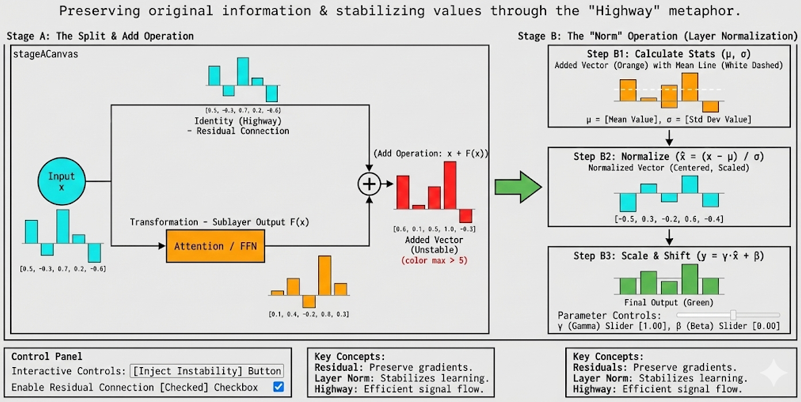 What to Look For: When exploring the tutorial, observe: (1) How the input splits into two paths (identity and transformation), (2) How the "Add" operation merges both paths, (3) How "Inject Instability" causes red (unstable) bars in "Add" stage, (4) How "Norm" stage stabilizes values to green (stable) bars, (5) How disabling residual connection loses original information, (6) How normalization breaks down into centering (subtract mean) and scaling (divide by std dev). This demonstrates that Add & Norm is essential for deep networks: residual connections preserve information flow, and Layer Normalization prevents numerical explosions.