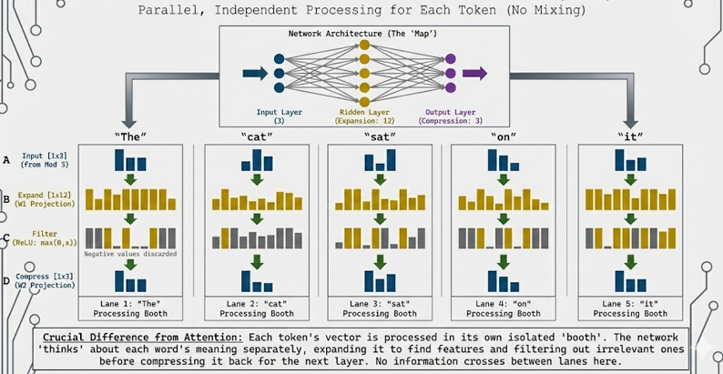 The tutorial visualizes the Expand → Filter → Compress mechanism. The expansion (3 → 12) creates a richer representation space where the model can learn complex features. The ReLU filter acts as a decision mechanism, keeping only positive (relevant) features and discarding negative (irrelevant) ones. The compression (12 → 3) projects back to the original dimension, maintaining compatibility with the next layer. This process happens independently for each token - "The" is processed in its own lane, "cat" in another, etc., with no information crossing between them.